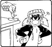 tous gardent un œil sur lui et ce, malgré le fait que Titi (TweetyBird) est assez malicieux pour se garder tout seul contre ce pauvre gros